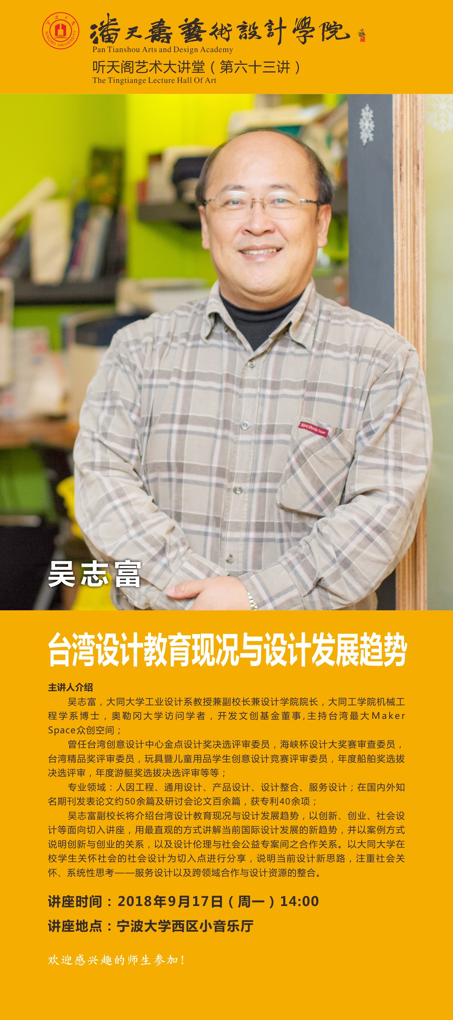 吴志富副校长将介绍台湾设计教育现况与设计发展趋势,以创新、创业、社会设计等面向切入讲座,用最直观的方式讲解当前国际设计发展的新趋势,并以案例方式说明创新与创业的关系,以及设计伦理与社会公益专案间之合作关系。以大同大学在校学生关怀社会的社会设计为切入点进行分享,说明当前设计新思路,注重社会关怀、系统性思考——服务设计以及跨领域合作与设计资源的整合。