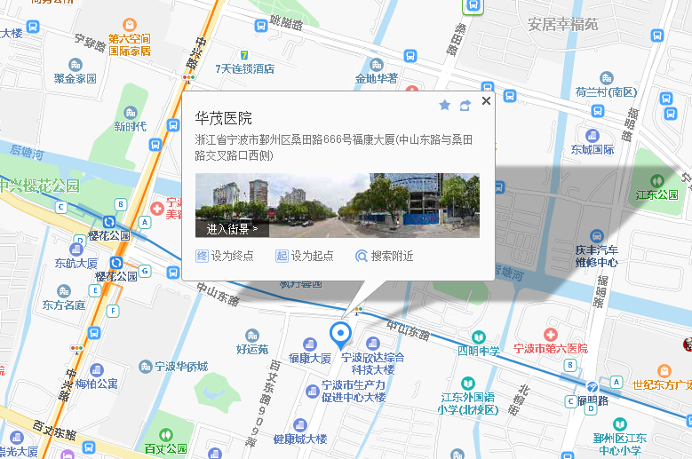 2、宁大附院高端医疗院区(华茂医院健康管理中心):宁波市鄞州区桑田路666号华茂医院(中山东路与桑田路交叉口西南角福康大厦,华茂医院健康管理中心)