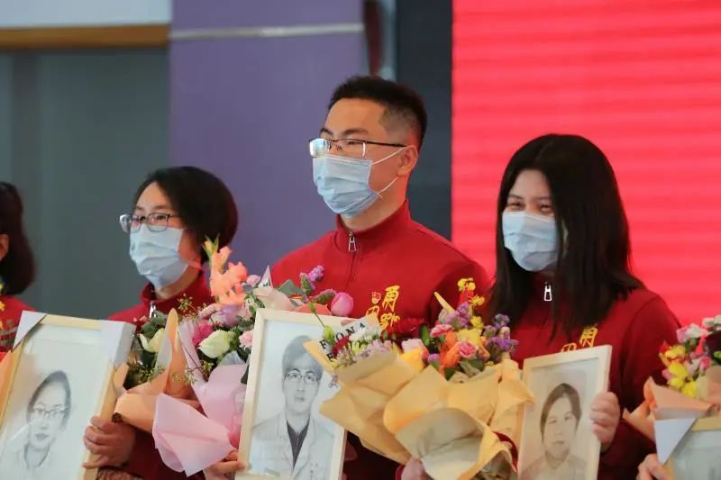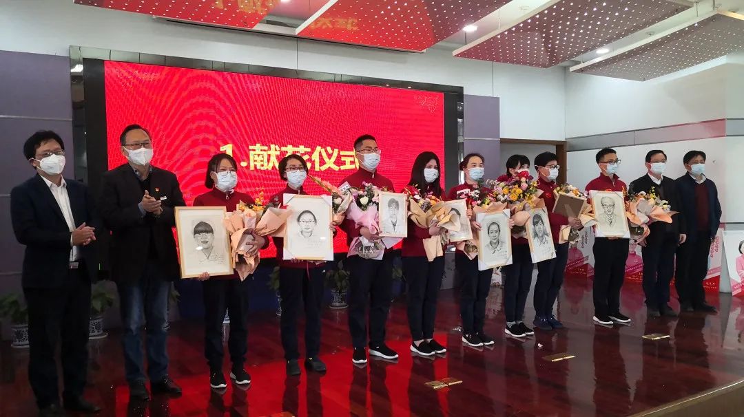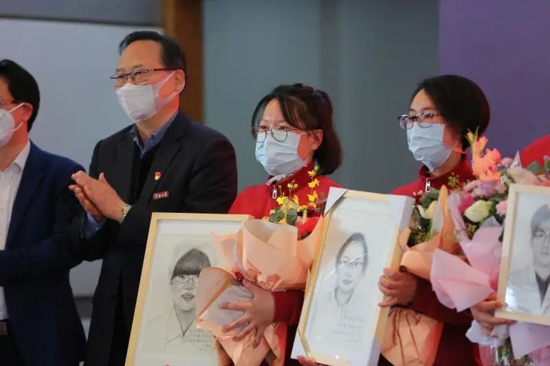 欢迎仪式上,校领导向全体援鄂医护人员代表献花,并赠送一份特别的礼品——书写着“医往无前,英甬归来”字样的工作服素描画。其中留作抗疫纪念的素描肖像由我院、天天看小说