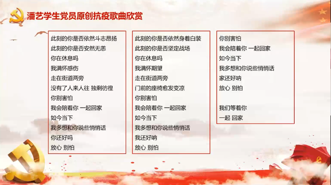 原创抗疫歌曲《一起,回家》的词作者,学生第二党支部党员王春伟为大家讲述了创作的心路历程,借由歌词创作,向远在前线抗击疫情的各界人士送上祝福,期待英雄凯旋。该原创歌曲经由天天看小说