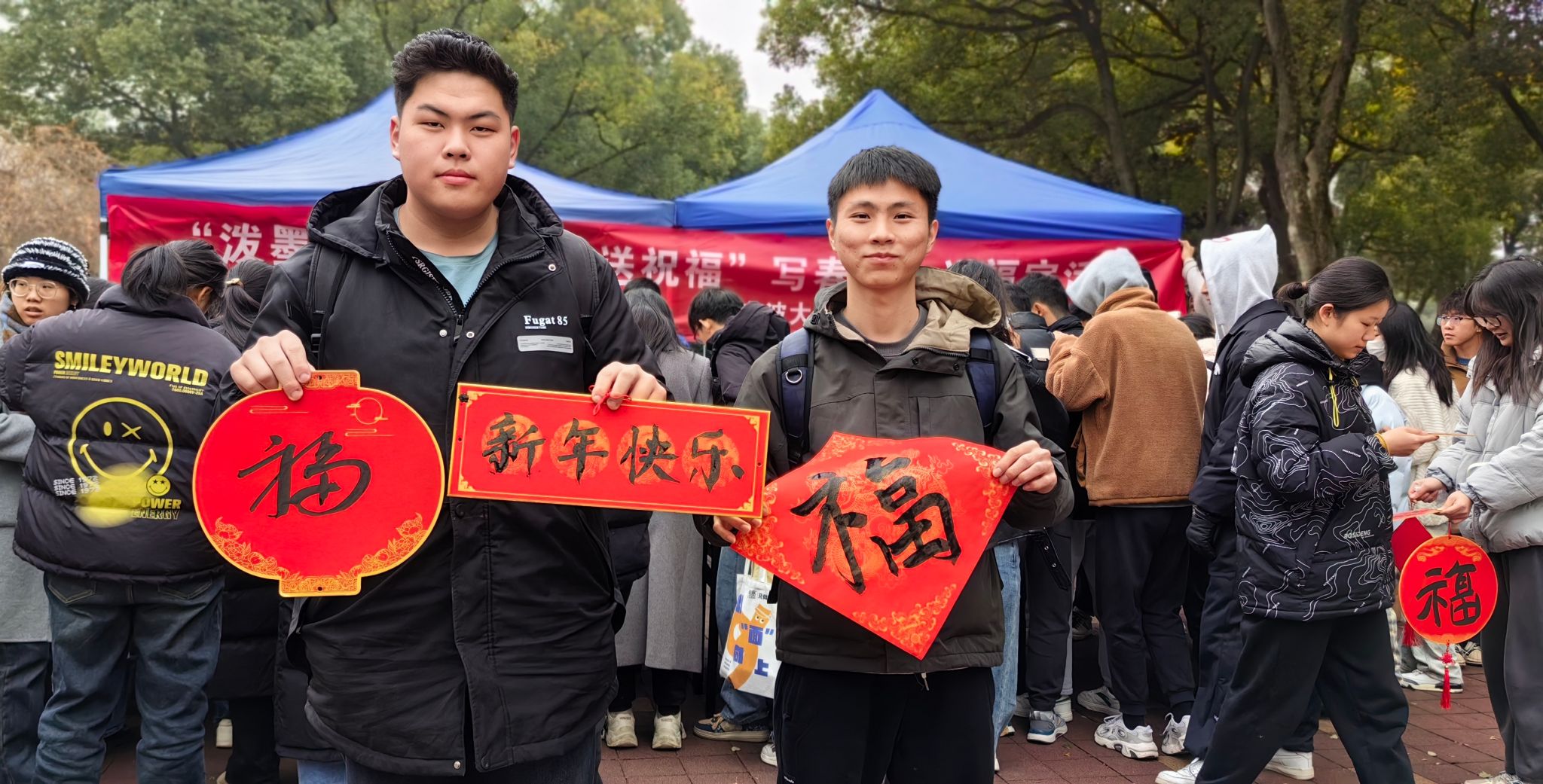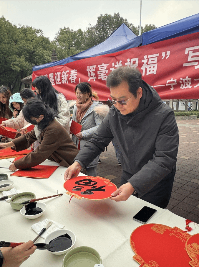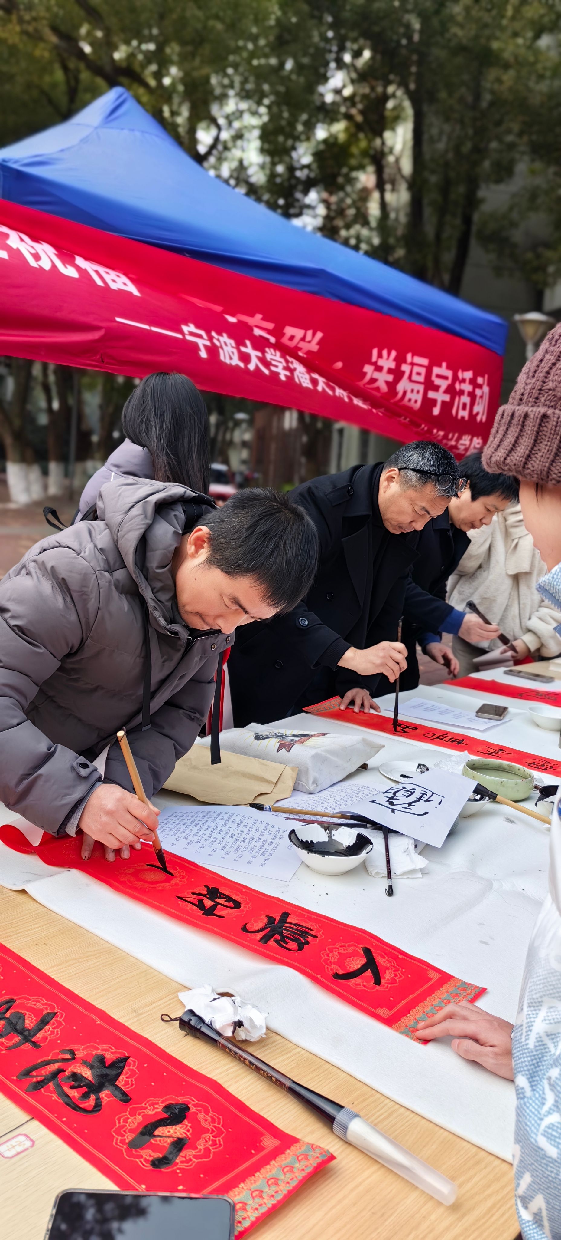 活动现场,学院美术系师生发挥专业特长挥毫泼墨,为广大师生书写出一幅幅散发着清新墨香的春联、福字,把浓浓的年味儿和新春祝福送到了在场的师生们手中和心里。开心的老师和同学们拿着翰墨飘香的福字和春联纷纷与身边的书画家们合影留念。这场活动共送出约六百套春联和福字,为冬日的宁大校园增添了浓郁的迎春氛围,打造了校园美育的新风尚。