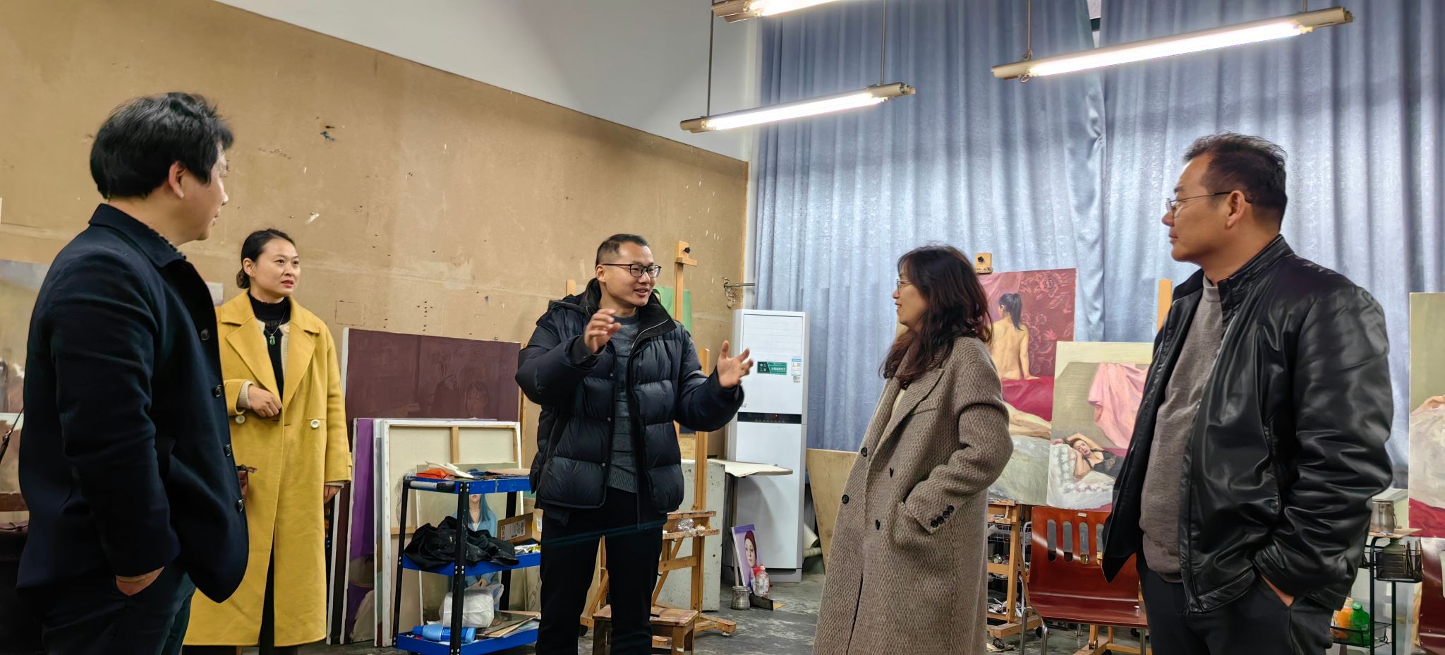调研过程中,董泉主任带领调研团队参观了美术专业的工作室和展览空间,详细介绍了课程建设和工作室专业教学等方面内容,调研交流会上,黄钟军副院长介绍了学院的发展沿革和专业情况,杨勇副院长比较系统的介绍了师范专业认证过程中的各项工作,也提出了一些有效的工作建议,董泉主任和江虹主任就师范认证的具体材料向老师们进行了展示和解读。会上,大家畅所欲言,在专业发展和课程建设,以及学科发展,工作室改革等方面都进行了深入探讨,双方均表示受益匪浅,也达成了加强互动,共同提升教育教学和学生培养质量的共识。