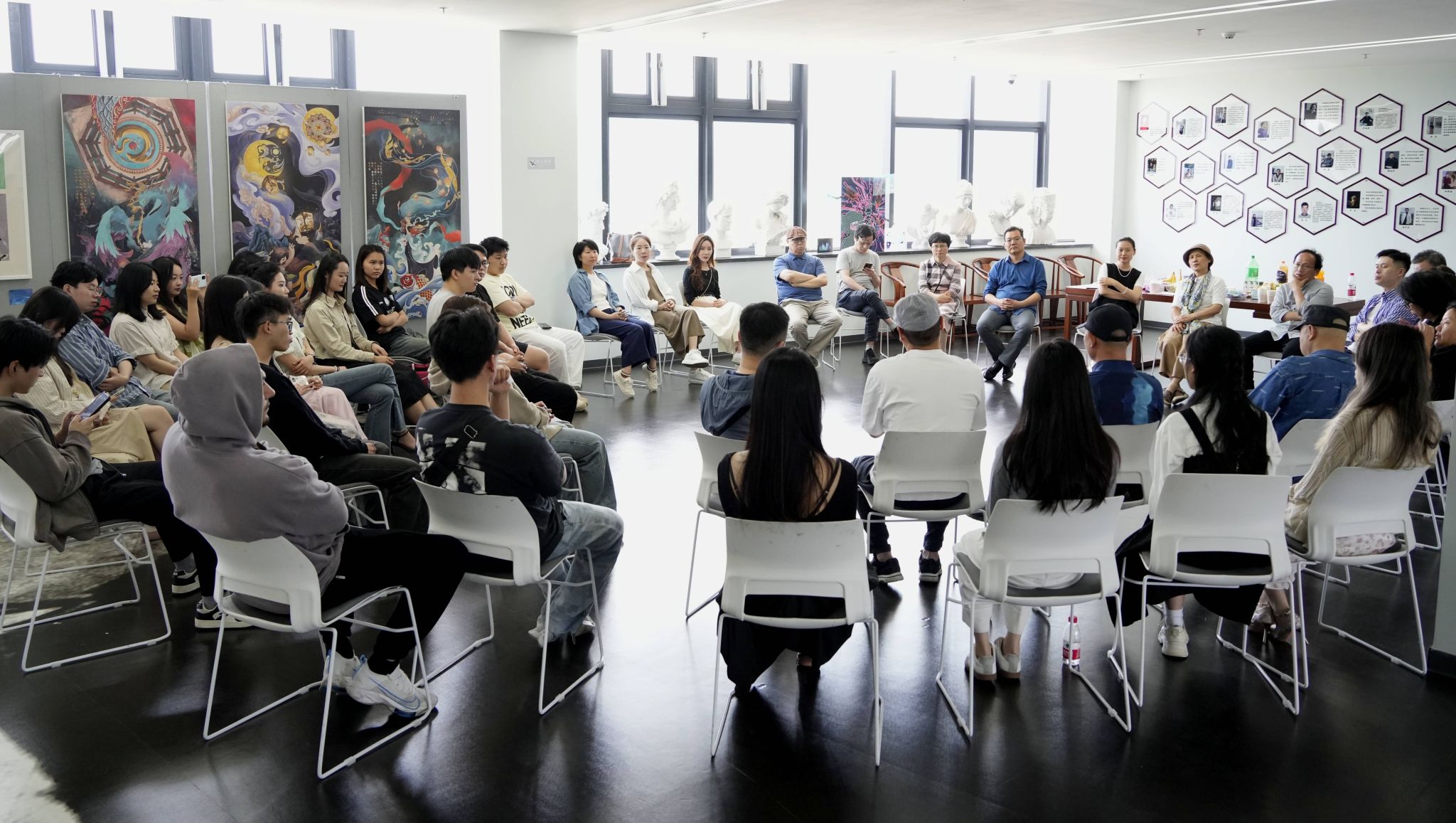 最后,陈晟主任总结发言,对大家的作品充满活力表示赞许,希望同学们在毕业后仍能保持对专业的热情,继续坚持创作,把艺术作为安放心灵的美好家园。陈老师的话语激励了在场的每一位师生,也为本届毕业作品展开幕和师生座谈画上了圆满的句号。