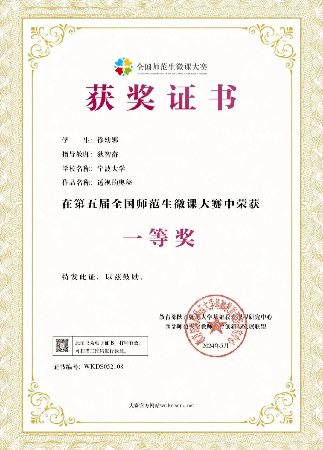 v 近日,由学院美术系狄智奋副教授指导的2023级研究生徐幼娜同学在第五届全国师范生微课大赛中荣获一等奖。