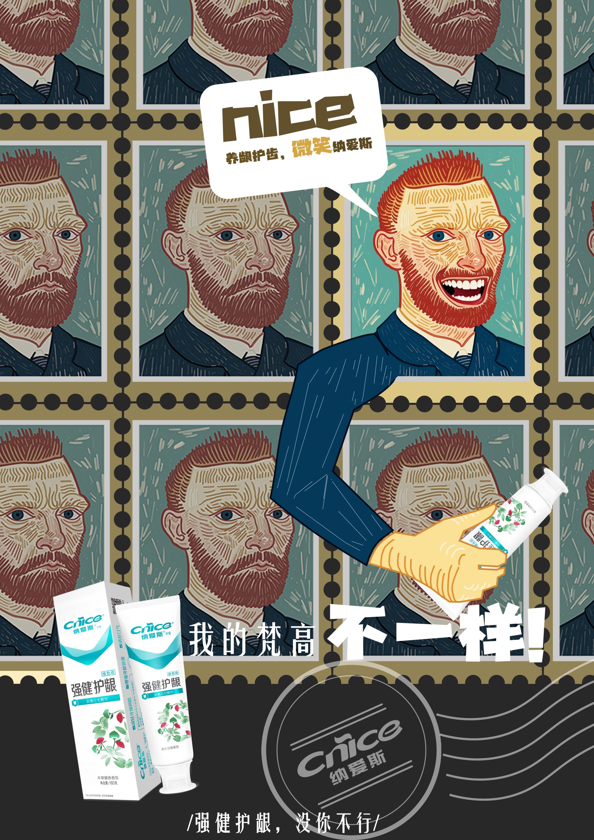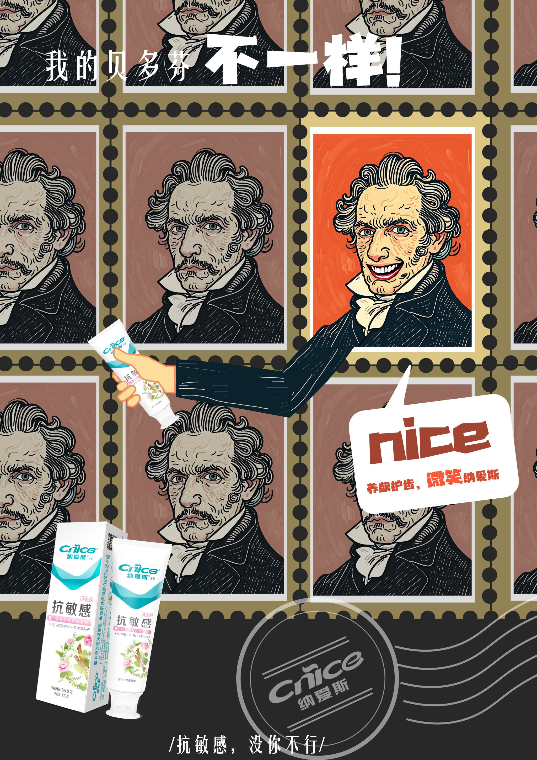 最后,我们做了细节方面的调整,如邮票边框与类似装裱画框造型的调整、胶卷配色边框与邮戳装饰,丰富画面,强调产品名;特异部分人物增加握牙膏的手臂,体现“名人”“药膏”“微笑”之间的关系;增加“对话框”和“我的XX不一样”“清火护龈,没你不行”等标语。