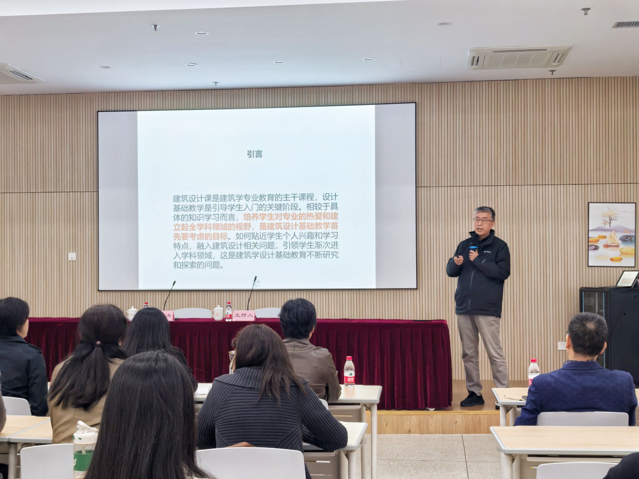 第二环节,张建涛教授带来了主题为“建筑设计基础教学内容重构与方法创新——以空间生成为线索的建筑设计基础教学实践探究”的讲座。他详细介绍了如何以空间生成作为教学主线,从课程内容到教学方法进行系统性重构,提出了一系列创新的教学模式。这些方法在强调学生实践能力的同时,也注重理论与实际的结合,为建筑设计基础教育提供了全新的思路。