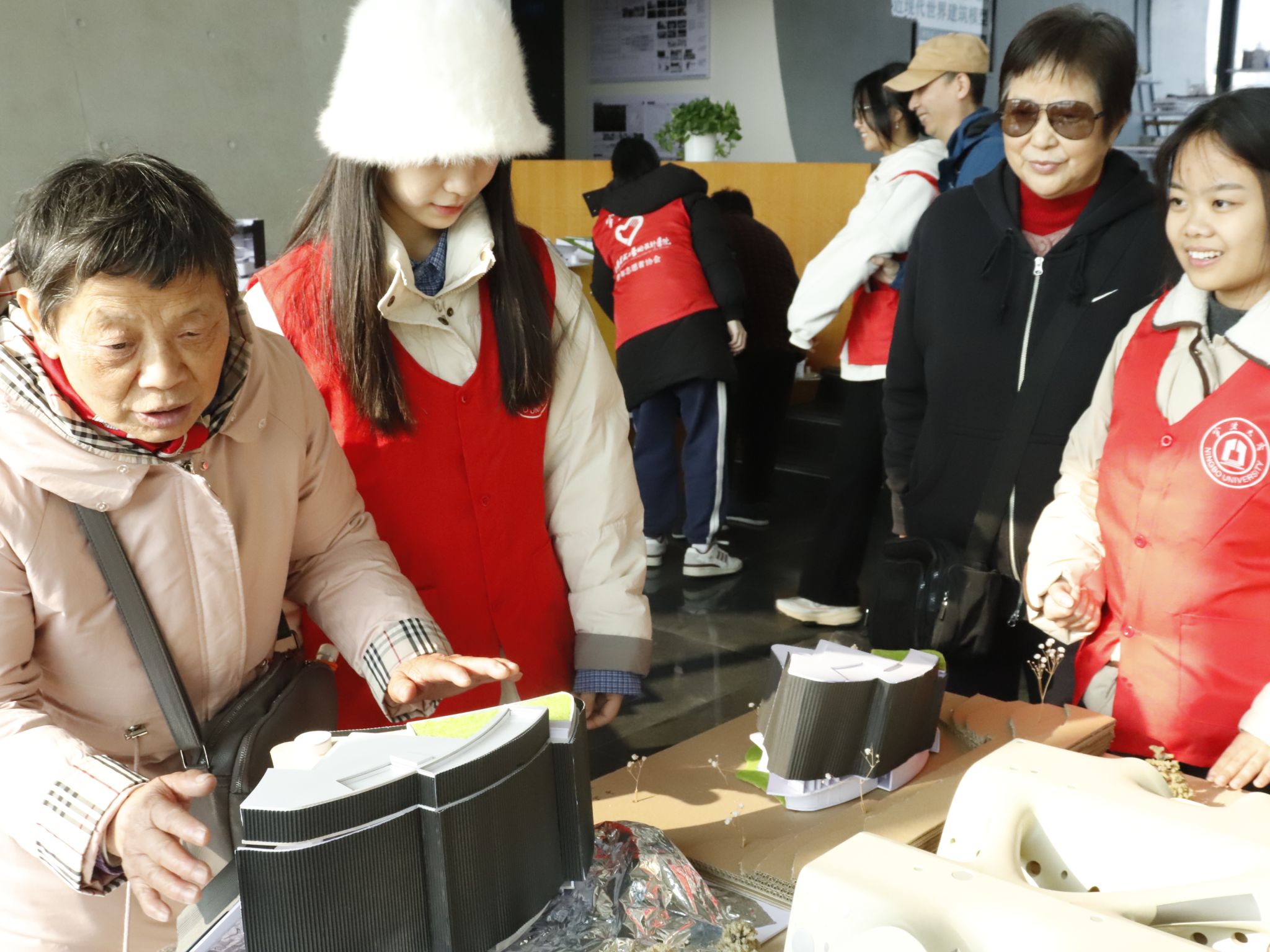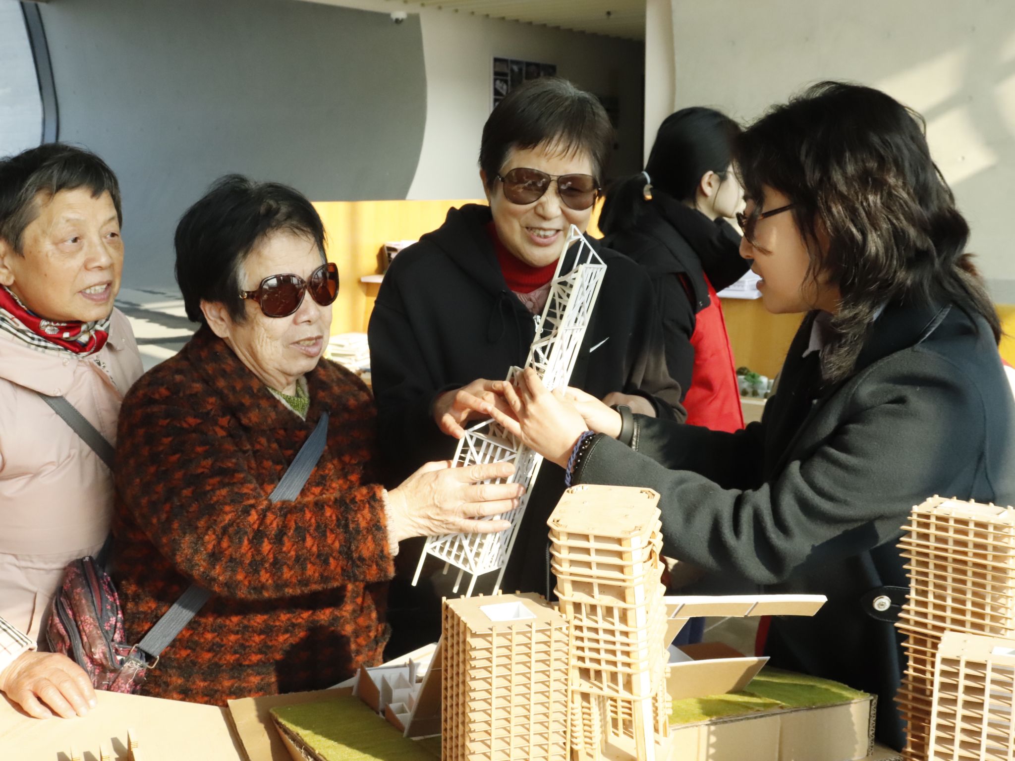 随后,志愿者们又带领视障人士进行听嗅交互体验,通过音频设备播放声音体验听觉,通过烧杯装置体验嗅觉。在教学楼的公共空间内,亲手抚摸建筑模型,通过触觉去体验丰富的世界。