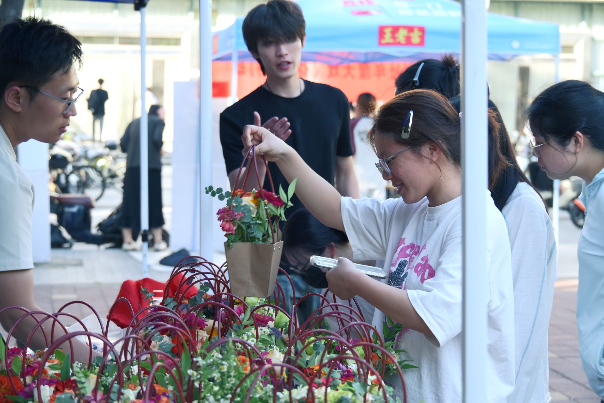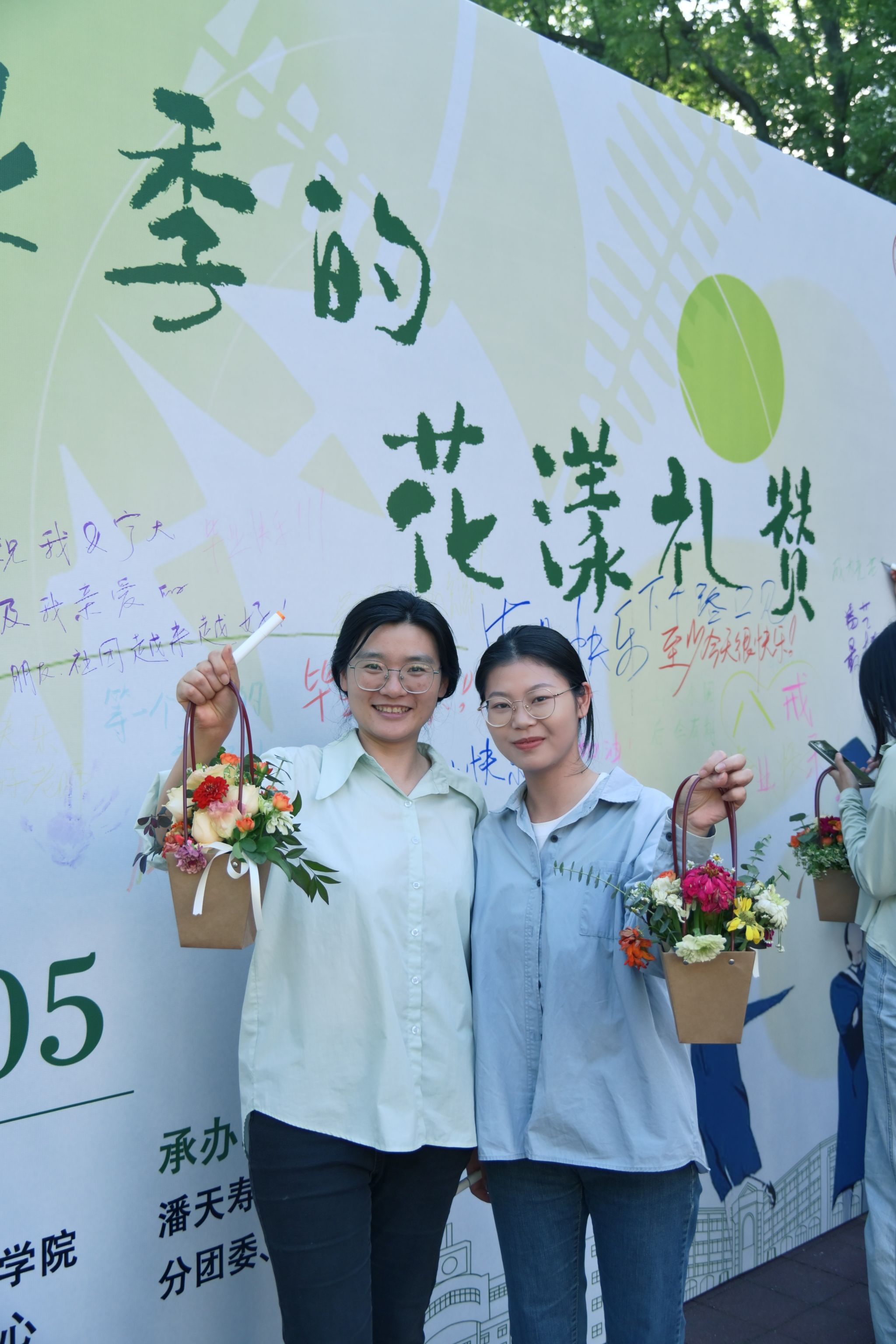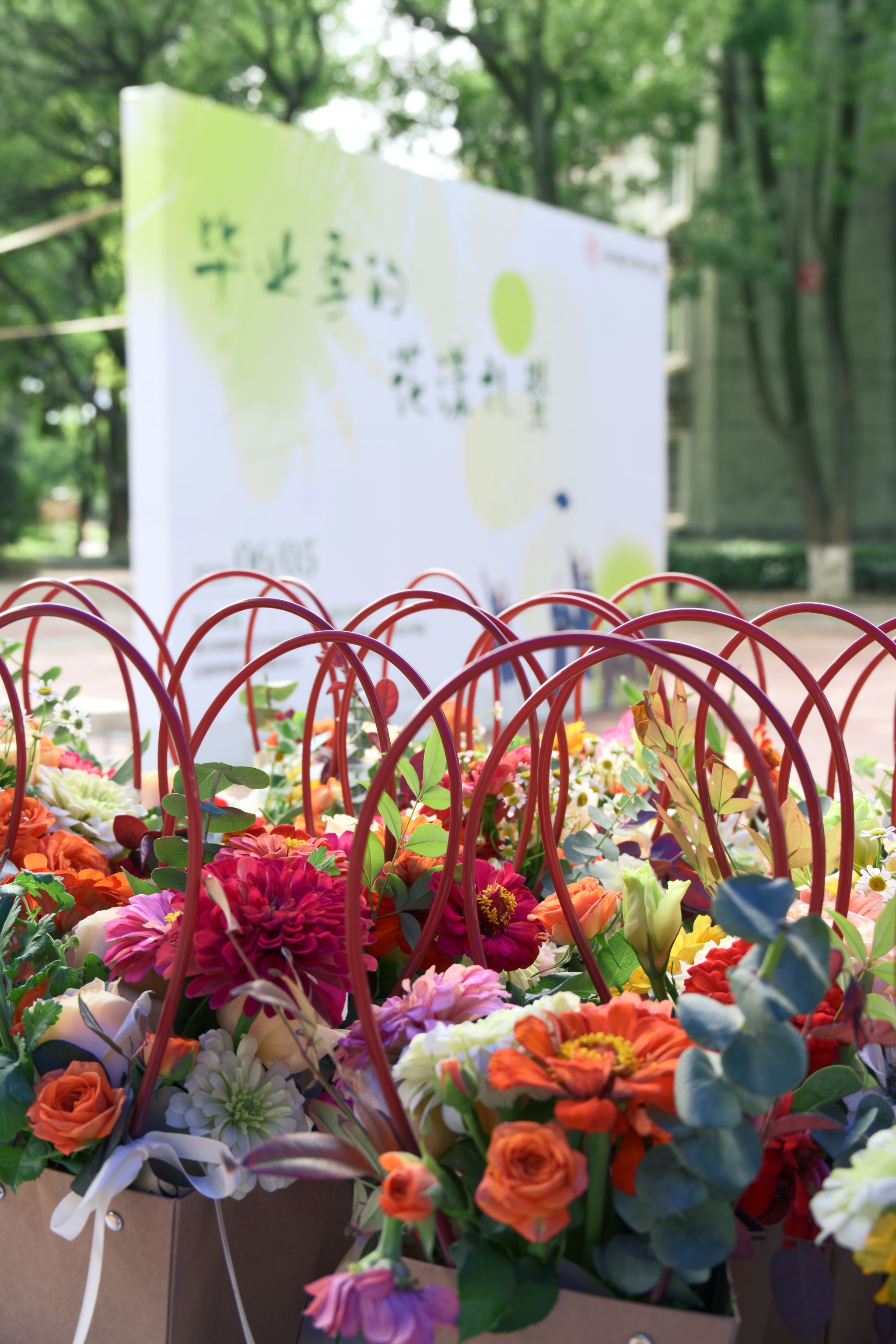 6月5日清晨,20余名低年级学生手持花剪,在晨露未晞时采撷下最饱满的花枝。“每支花茎保留35厘米长度”“采用螺旋式手法捆扎”,在园林绿化中心老师的现场指导下,200余份手工花束陆续完成。在有思广场,学弟学妹们将带着缀满祝福的花束送至他们手中,喷绘上写满了毕业季的祝福。