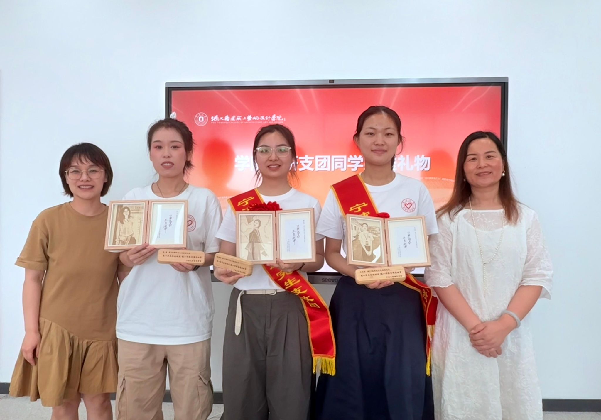 分享结束后党委书记韩雯琛和学生工作负责人洪蓉蓉为第27届研支团成员佩戴荣誉绶带,并代表学院向三位研支团成员赠送纪念品。