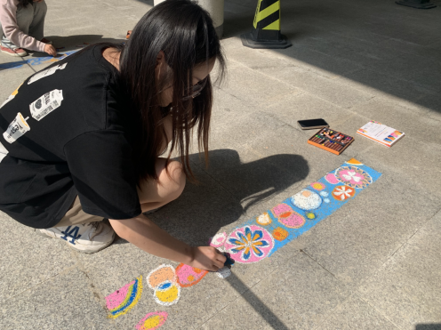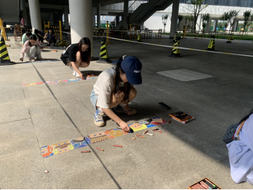 “臻美设计美育工作室”策划,工业设计、行政教辅以及学生第一党支部实施。师生设计并绘制了丰富多彩的一米线,并展示了周至禹教授运用废弃石膏模型创作的彩绘艺术作品,让师生在观看艺术作品的同时,保持了一米的健康社交距离,以艺术的方式强化了一米线,传递了美的享受,在疫情防疫工作下为校园增添了美的色彩,缓解了师生排队中的焦虑情绪,将防疫工作与美育工作相结合,同时也是党建加美育的一次有益尝试,活动得到了现场师生的好评。