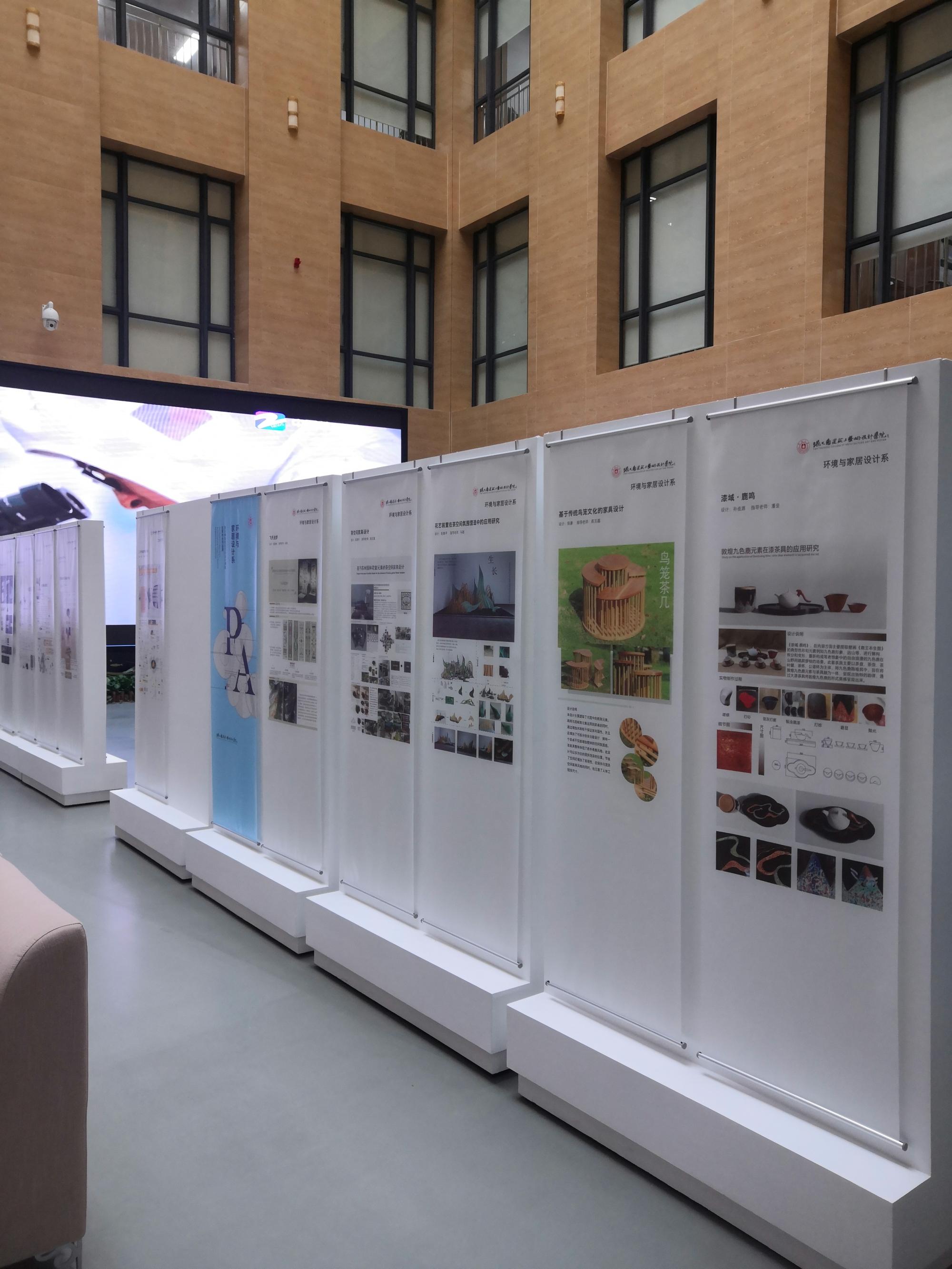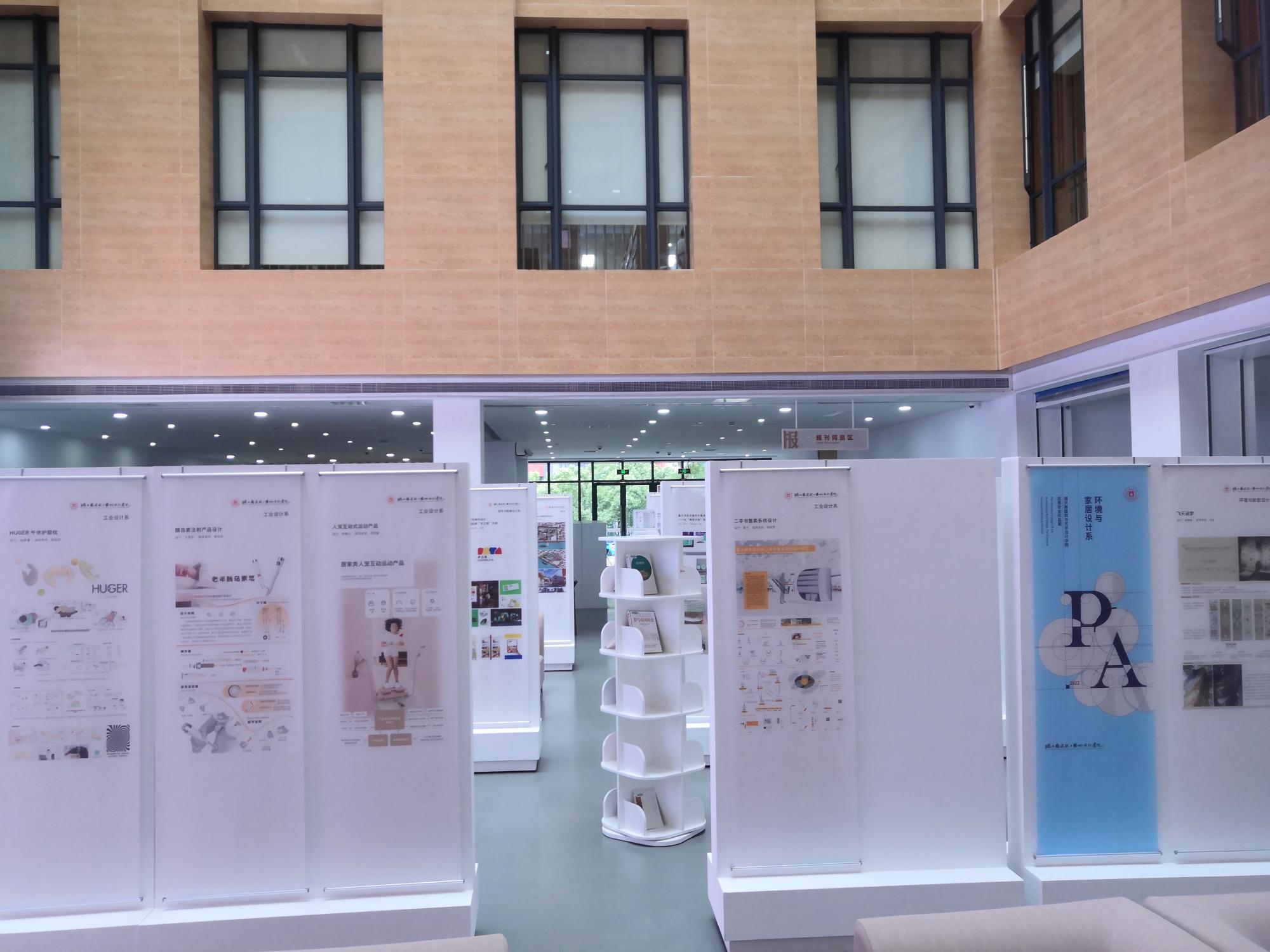 梅山校区图书馆大厅展出。展出作品包含了面向脑卒中患者的上肢康复训练产品设计、智慧生活——适老生活体验馆建筑设计、龙宫村文化中心建筑策划与设计——侧重古村适宜生态技术传、大脑island工作日常、自媒体时代下红色革命纪念馆IP形成设计——以方志敏为例、基于苏州园林花窗元素的茶空间家具设计、漆域·鹿鸣等百余件优秀主题作品图示与创作理念。