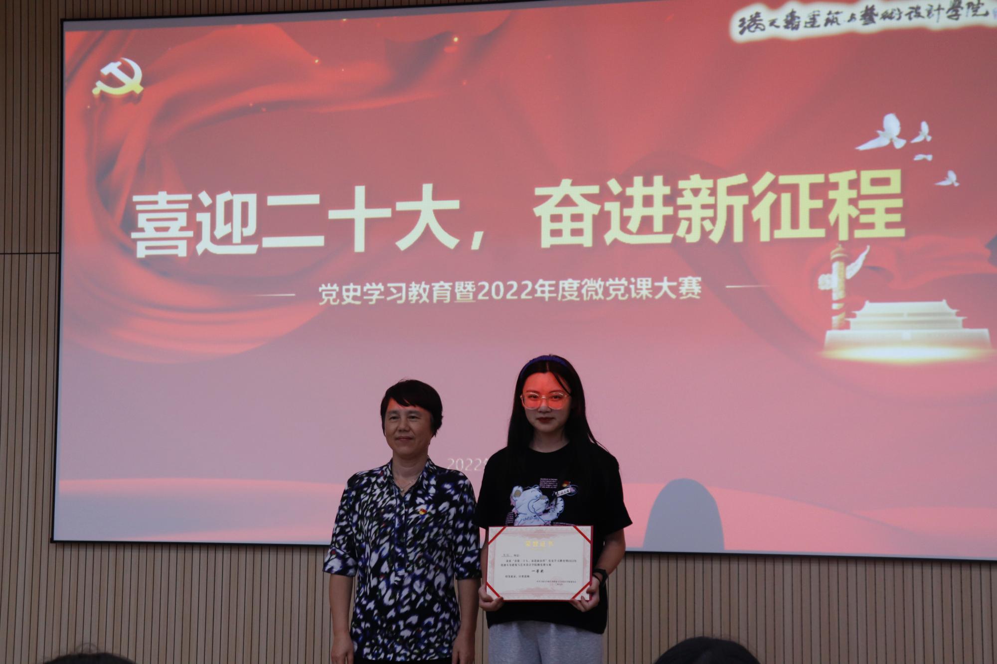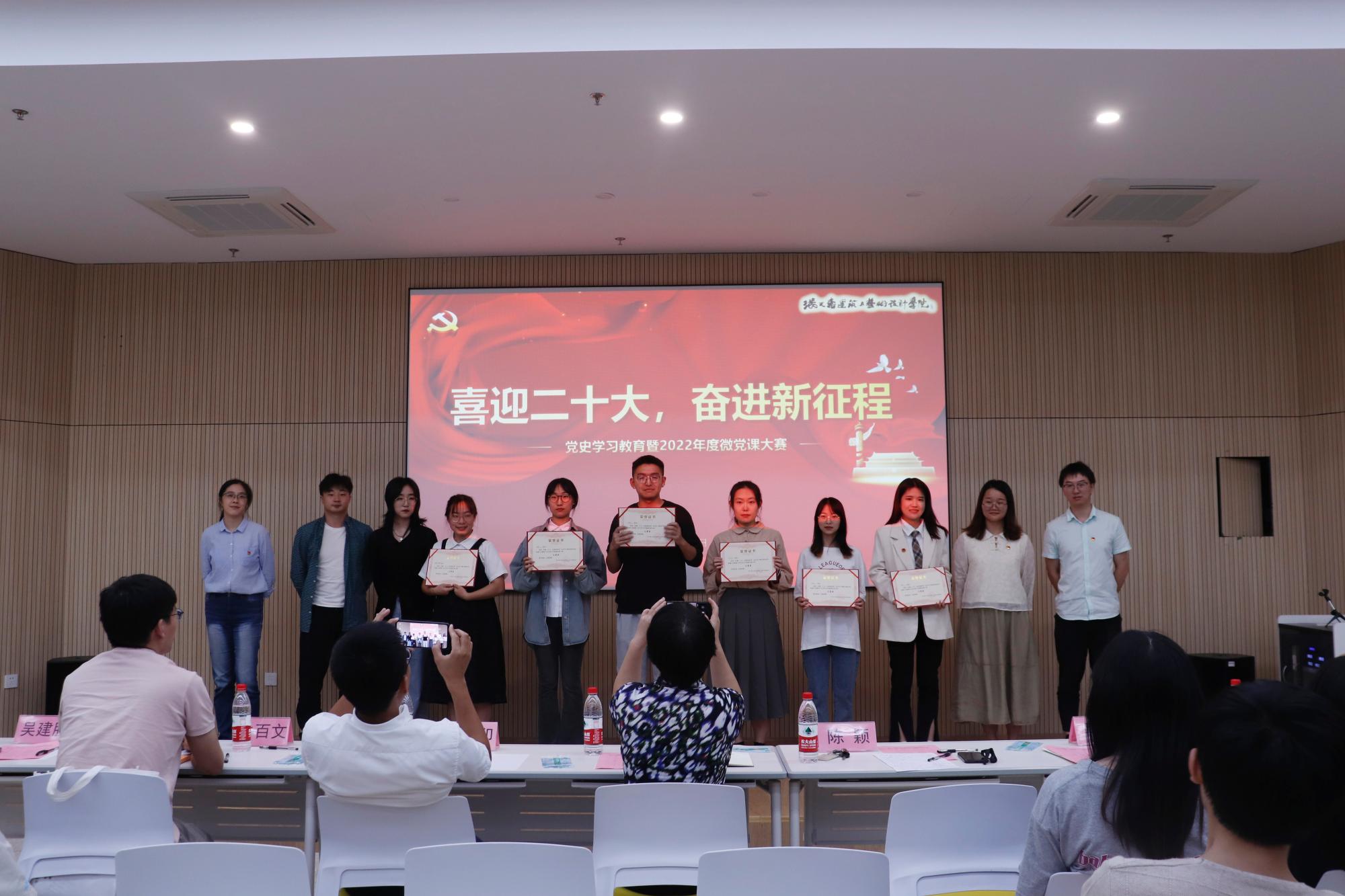 经过评委现场打分,陈唯同学的微党课获得一等奖,蒋淼、张晴、徐白雪、张心怡获得了二等奖,李欣然、贾睿英、邓雅云、屠祎博、张雅歌、丁嘉浩、周璇同学获得了三等奖。评委老师们分别为获奖选手颁奖,并合影留念。