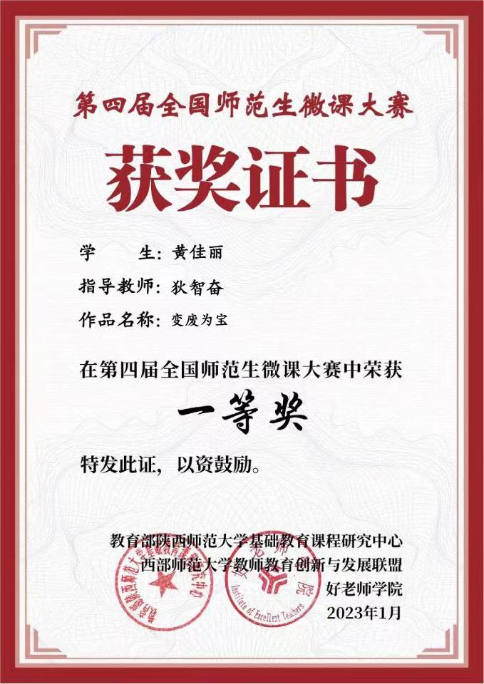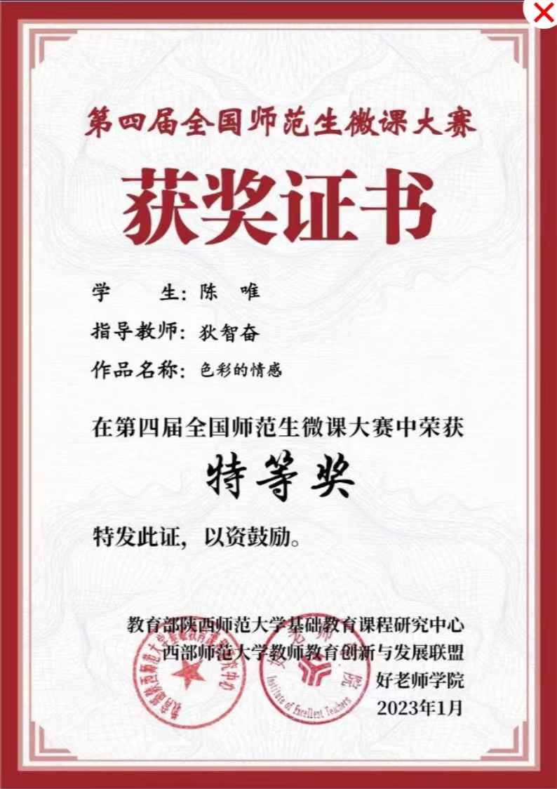 近日,第四届全国师范生微课大赛决赛评审结果正式公布,潘天寿建筑与艺术设计学院2019级美术学(师范)专业学生陈唯的微课《色彩的情感》(指导教师:狄智奋副教授)获特等奖,2019级美术学(师范)专业学生黄佳丽的微课《变废为宝》(指导教师:狄智奋副教授)获一等奖。