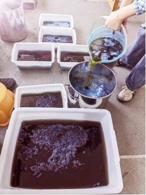 活动现场,特邀学院武会会副教授带领老师们共同体验草木染手工制作围巾,针对草木染的简要历史、技术、草木染料数量和种类等知识进行现场讲解,并结合现场染制工具进行了示范演示,随后参与活动的老师们自己动手体验了全部的草木染围巾制作过程。
