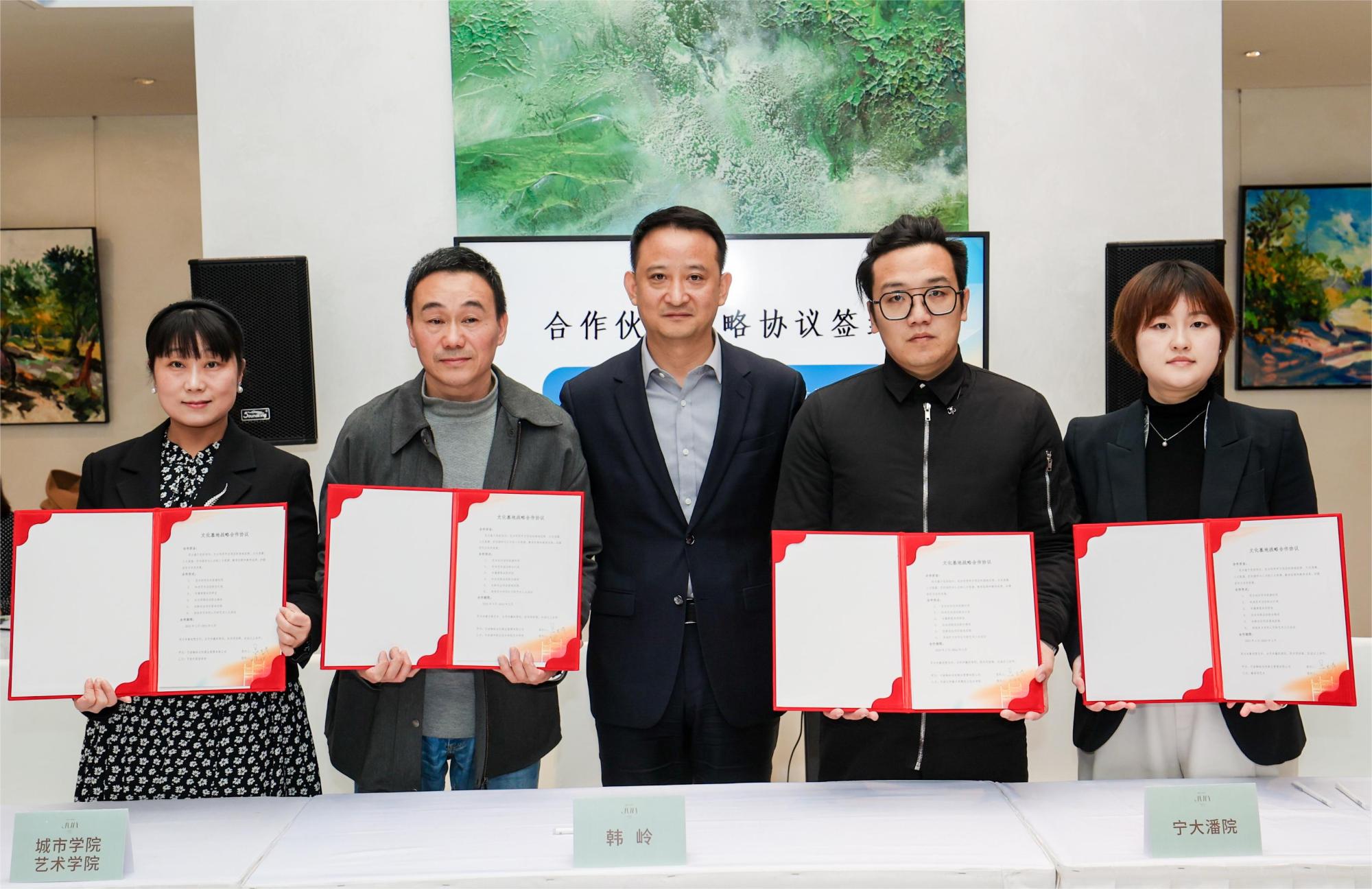视觉传达与数字媒体设计系主任王泽闻与东钱湖韩岭商管董事长吴志青代表双方单位在活动中签署了共建文化基地的战略合作协议。双方将以展览展陈、公共装置、文创周边、行为艺术、研学计划和大师讲堂等形式多样的内容进行深入合作,助力东钱湖品牌影响力的提升,全面贯彻党的二十大和省第十五次党代会精神,服务地方区域的文旅融合发展。