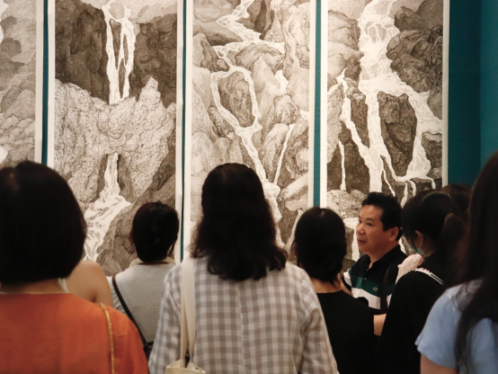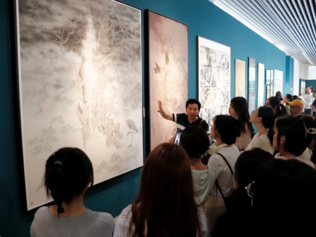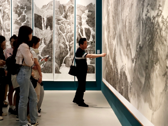 世界旅游博览馆共展示了四个专业学院的作品,分别是中国画与书法艺术学院、跨媒体艺术学院、雕塑与公共艺术学院和建筑艺术学院。老师带领同学们主要参观了中国画展区,最后唐卫志老师为同学们进行了详尽、细致的讲解。