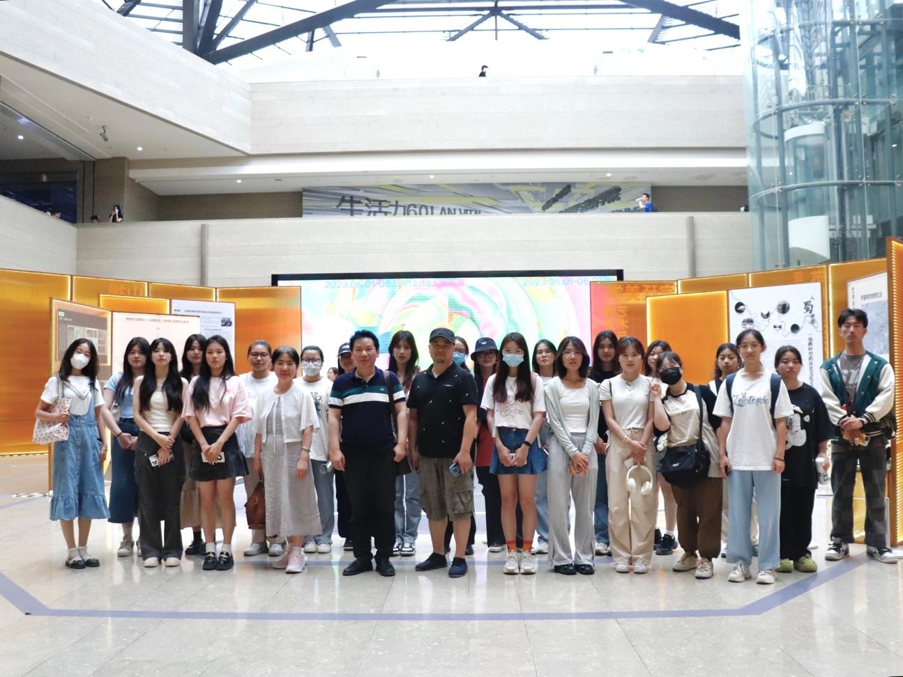 第一站老师与同学们来到了世界旅游博览馆,参观中国美术学院毕业展(湘湖展区),并拍摄了大合照。