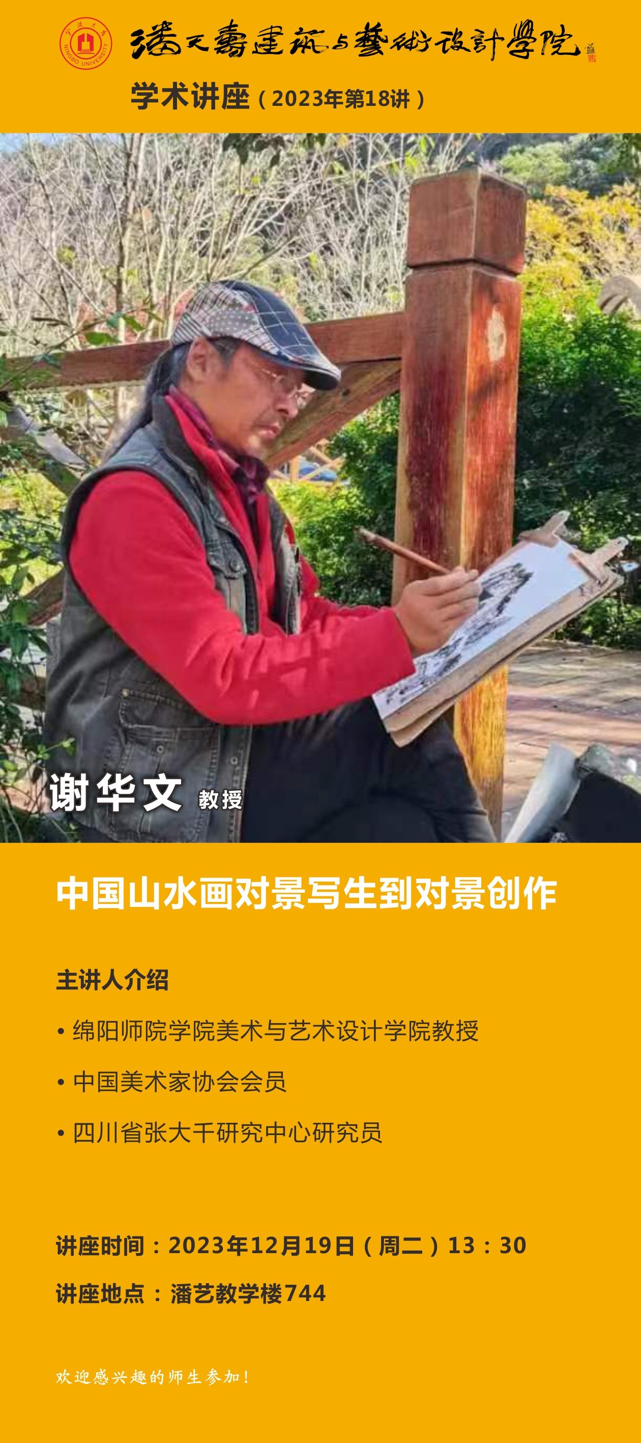 12月19日下午13:30,学院邀请绵阳师院学院美术与艺术设计学院教授、中国美术家协会会员、四川省张大千研究中心研究员谢华文教授,在学院744教室成功举办了《中国山水画对景写生到对景创作》的学术讲座活动。本次活动由学院书画方向硕士生导师邹湘平教授主持,毛沛定老师和美术系22、23级研究生积极参与,认真聆听。