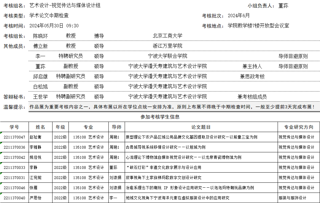 参加中期检查布展作品至少须提前三天完成布展,具体布展听从学位点统一安排。要求:专硕每人作品不少于2幅,按两个版面排版展出;学硕每人作品不少于1幅,按一个版面排版展出,展出版面尺寸规格为1200mmx900mm,版本具体排版格式要求由各专业自定,要求明确:学生姓名 学号 专业 研究方向 和导师。