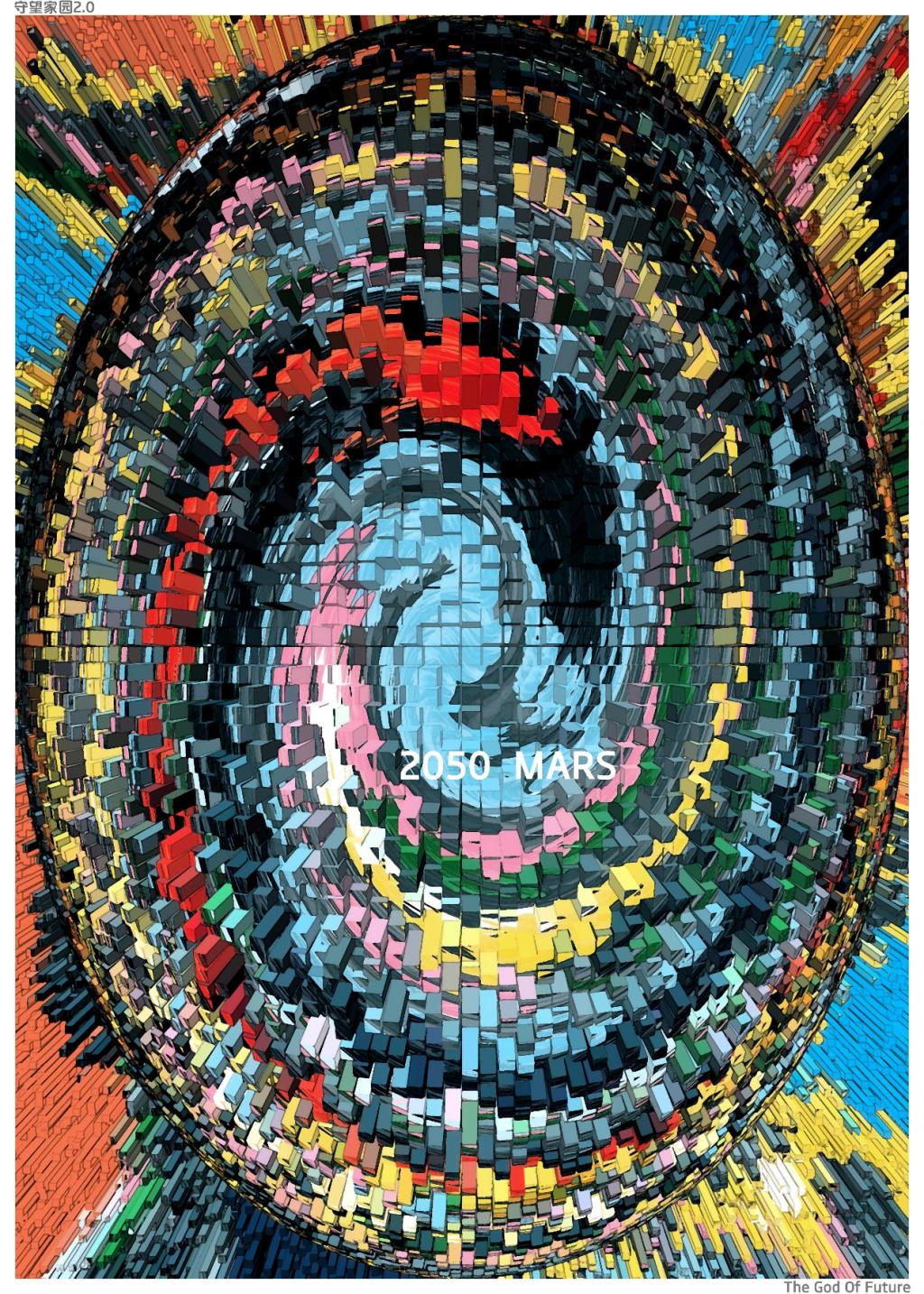 作品《创世纪2.0》从全局的角度观察和预言,愿登录火星的,未来的新上帝,人类本身,成为出色的文明传播者。本次创作以畅想三十年人类移民火星、改造火星为基础,融入壁画这一种人类最初的艺术出路,用想象力和隐喻构建了新世界的混沌模样,愿每一个观看者都能从中展开动态想象,构成新的史诗。