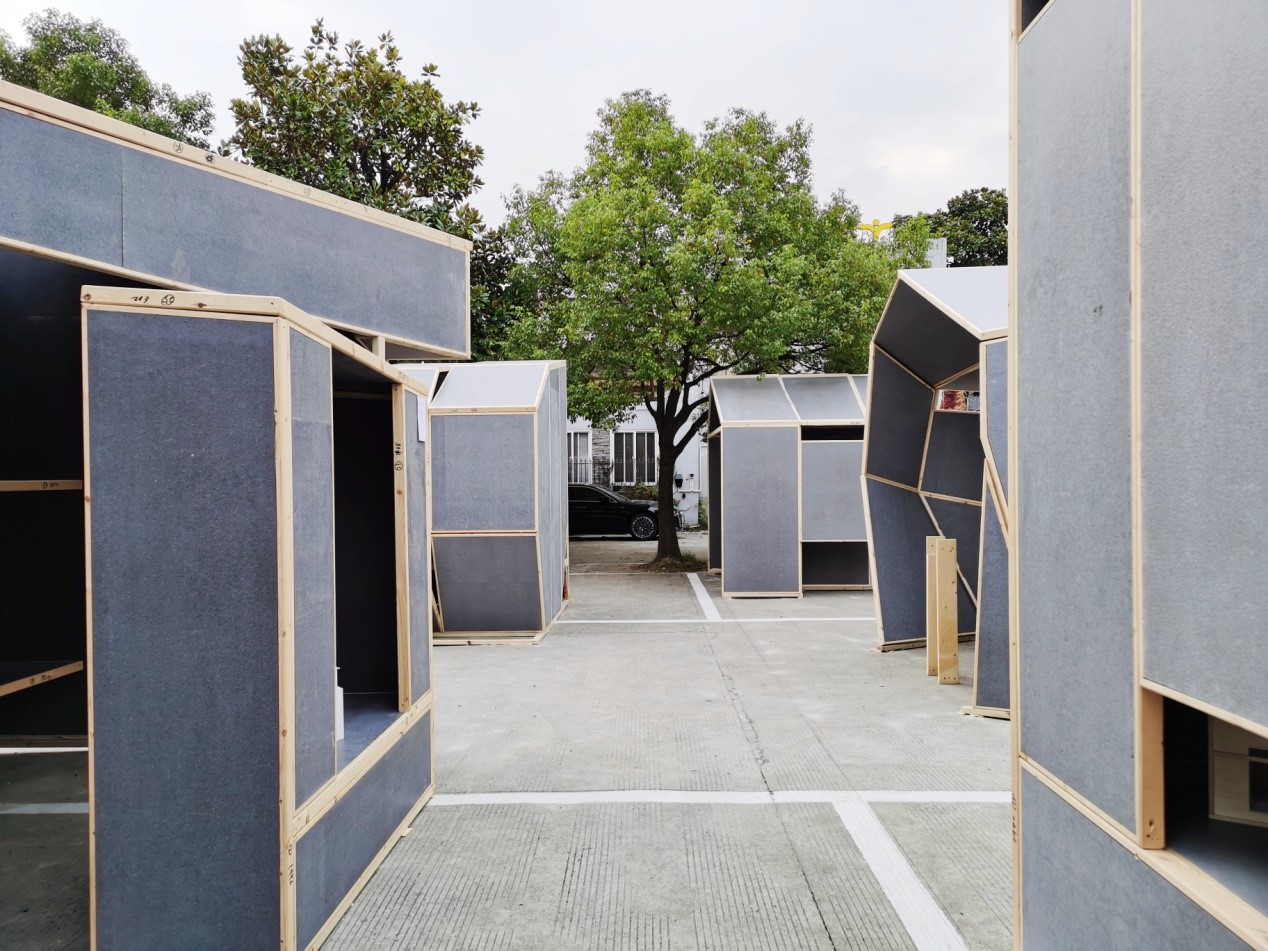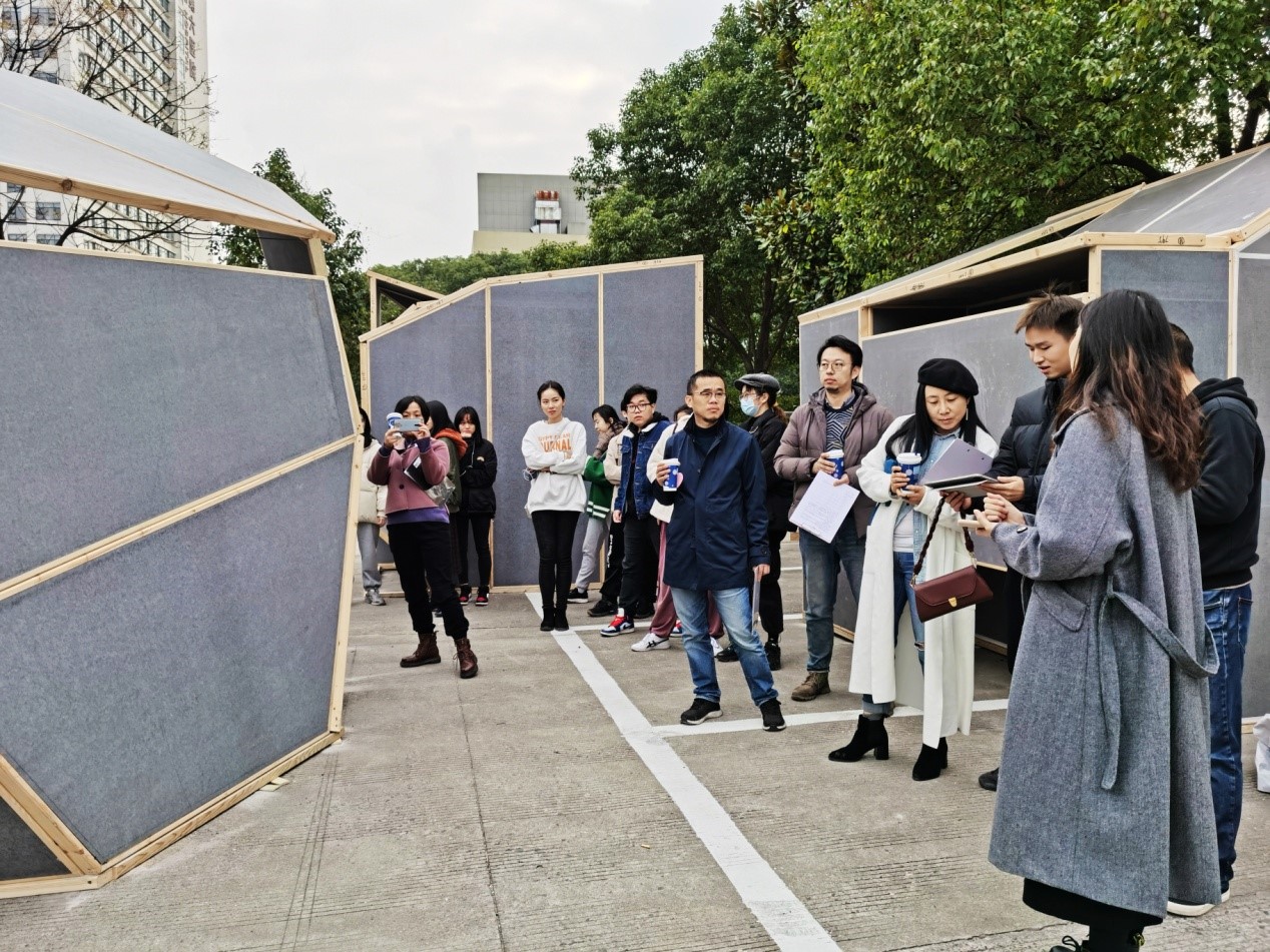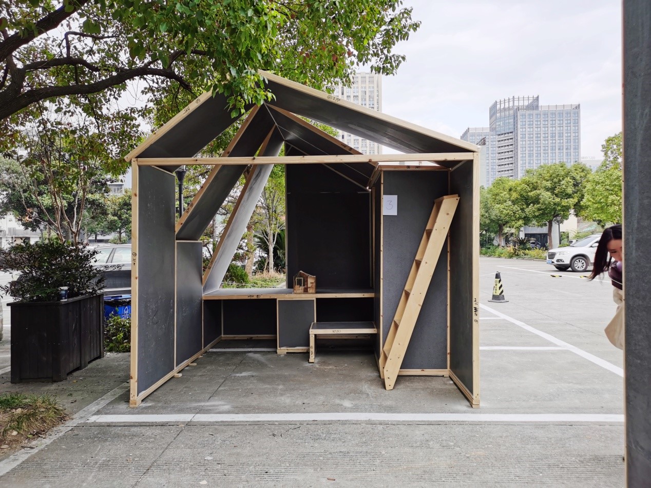 这是个初冬的星期日,中午有斜斜的暖意阳光,几天前的停车场出现了五座奇怪的小房子,三向三米的小房子都用轻质复合板组合,有的造型复杂,有的内部像迷宫,有的向水面开放。各路人马在这里慢慢汇集,组委会准备会场、同学们组队通关、评委们更关注创意的来源。